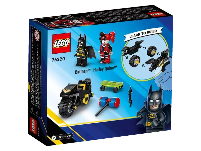 El set LEGO DC Batman contra Harley Quinn (76220) está diseñado para niños desde 4 años e incluye a Batman en su Batcycle y a Harley Quinn con su monopatín y mazo. Ofrece una experiencia de juego fácil y compartida, con bolsas separadas por modelo, un gran ladrillo inicial y guía ilustrada. Ideal para que adultos y niños construyan y jueguen juntos.